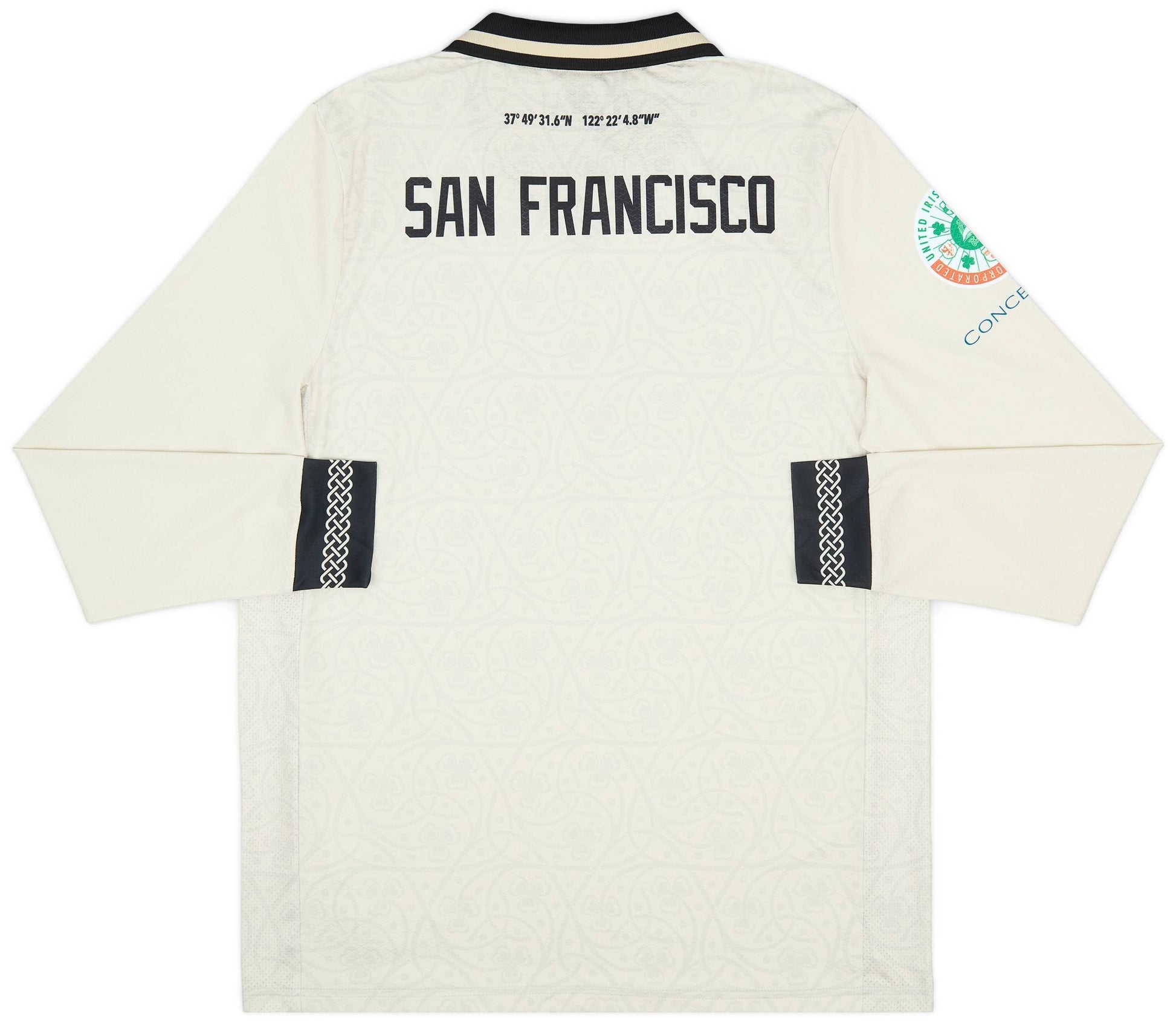 Le maillot extérieur des SF Glens pour la saison 2024-2025 rend hommage aux 63 ans d'histoire du club, notamment à son partenariat avec la Guinness, la bière brune la plus réputée au monde. Ce maillot blanc cassé est orné de nœuds celtiques, symbolisant l'esprit communautaire qui anime San Francisco depuis des générations. Au dos, on retrouve les coordonnées de leur futur domicile sur Treasure Island.